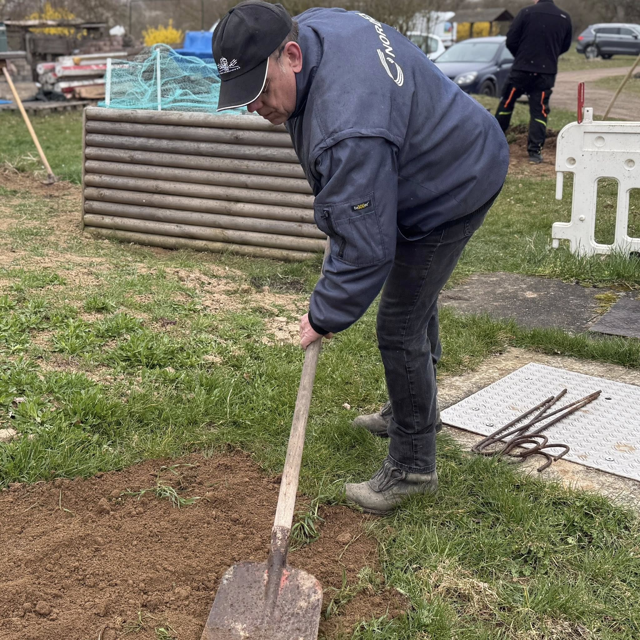 Der Juli Arbeitseinsatz der Vereinsmitglieder am 26.07. 25 war neben den ständig anfallenden Grünarbeiten bestimmt durch die Baustelle für den neu zu erstellenden Außenspültisch. Hierzu sollte vorab der Pflasterbereich vor dem Gäste und Sanitärhaus erneuert und erweitert und barrierefrei werden. Durch diese selbstgesetzte Vorgabe war es zwingend erforderlich die Höhe der Eingangstür zur Dusche anzupassen.