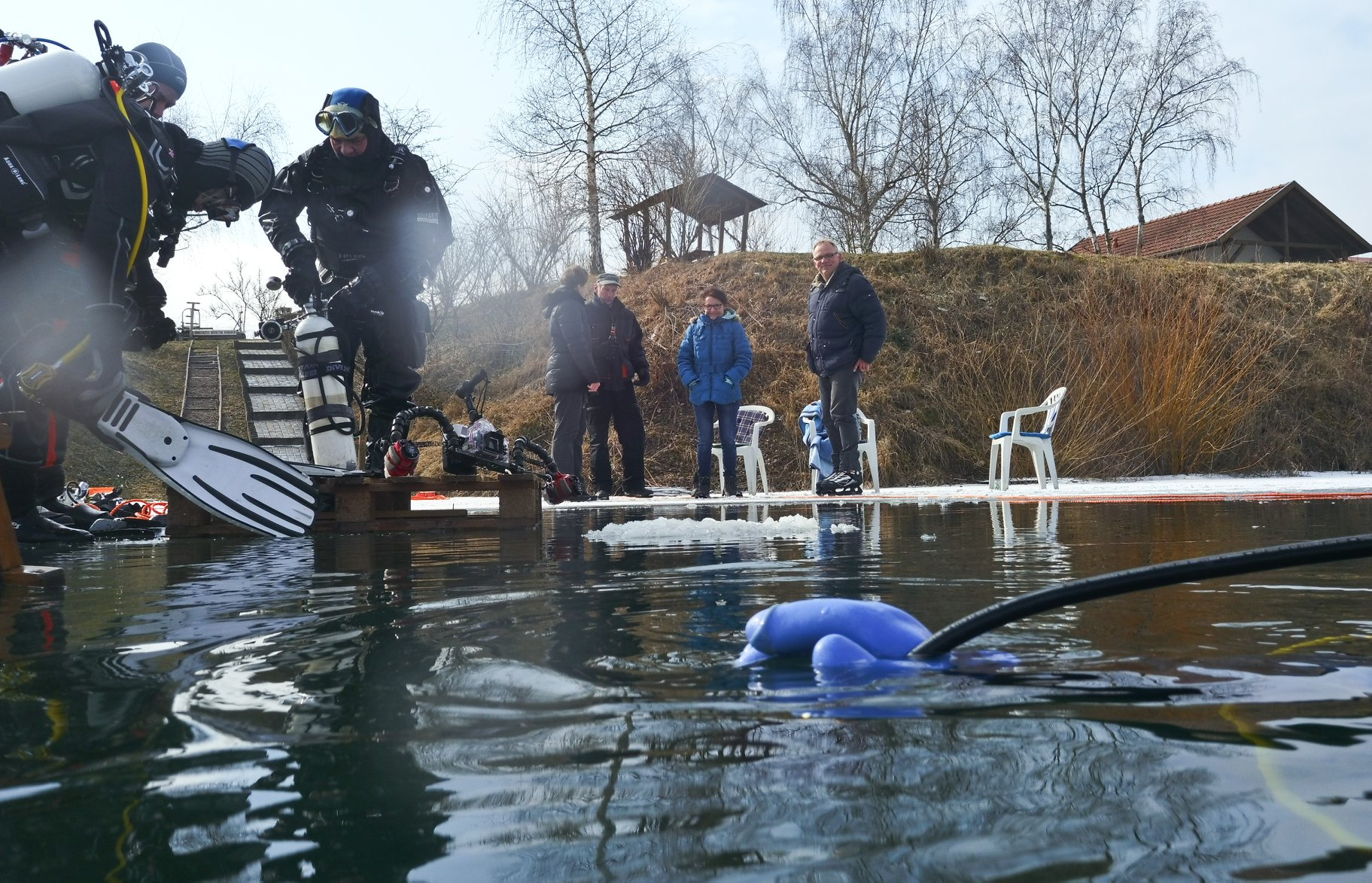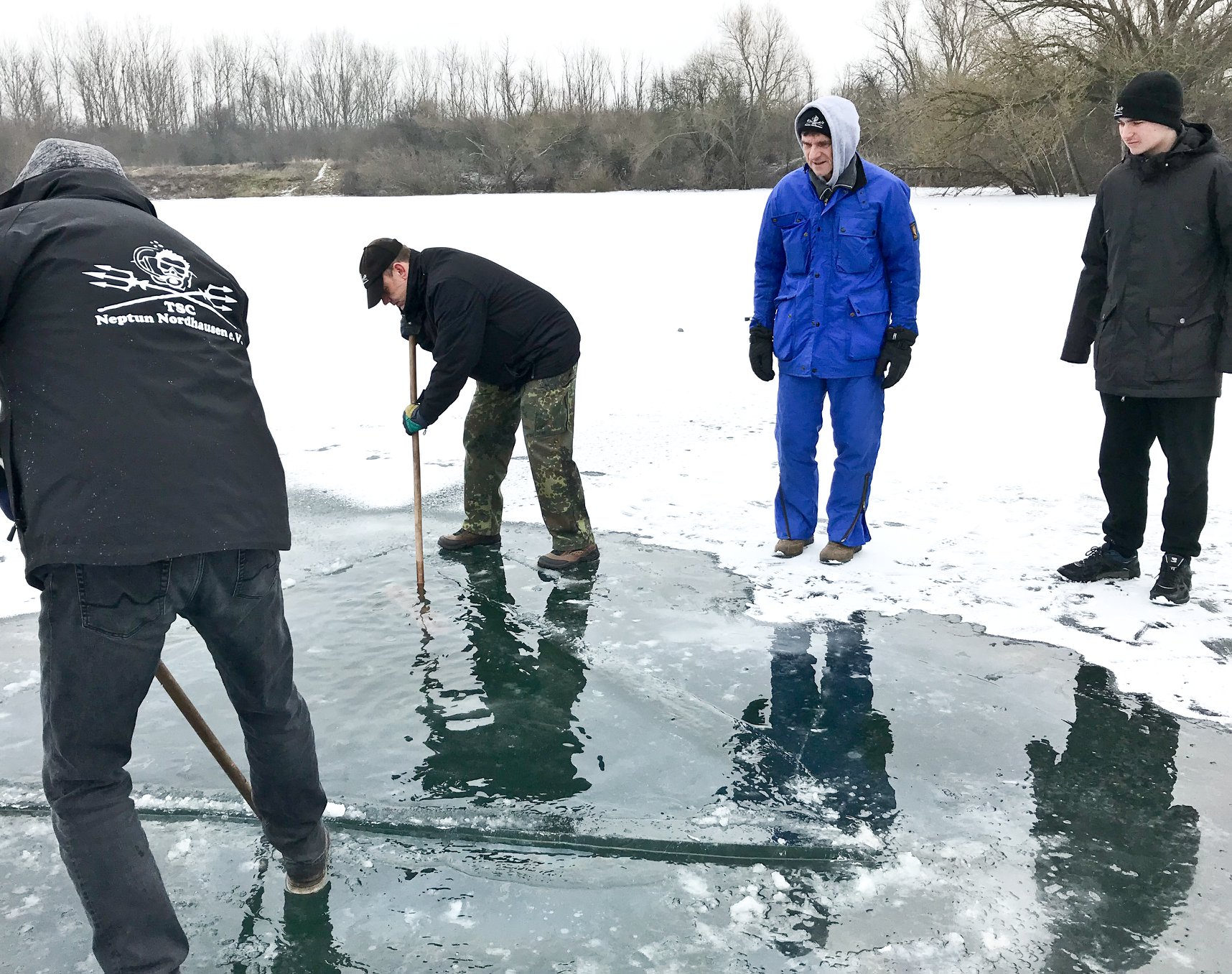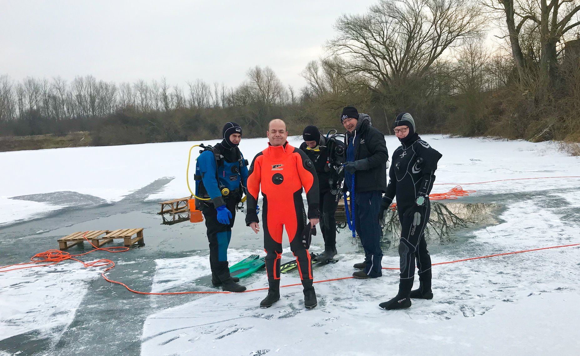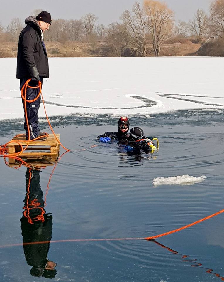 Die Nepturaner haben, nach dem das Eis vom 17. zum 18. Februar überraschend geschmolzen war, am 04.03. noch einmal zum spontanen Eistauchevent geladen. Und das war die richtige Entscheidung. Ein herrlicher Tag mit zunehmend steigenden Temperaturen und eine super glatte Eisschicht boten nahezu Top Bedingungen für ein solches Unterfangen. So waren dann auch, nach und nach an Seilen geführt, drei Tauchteams zu der mystischen Herausforderung gefolgt und sind unter die, den Weg nach oben versperrenden Eisschicht, getaucht.