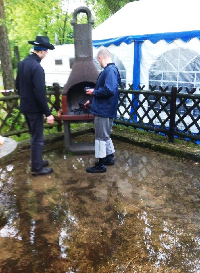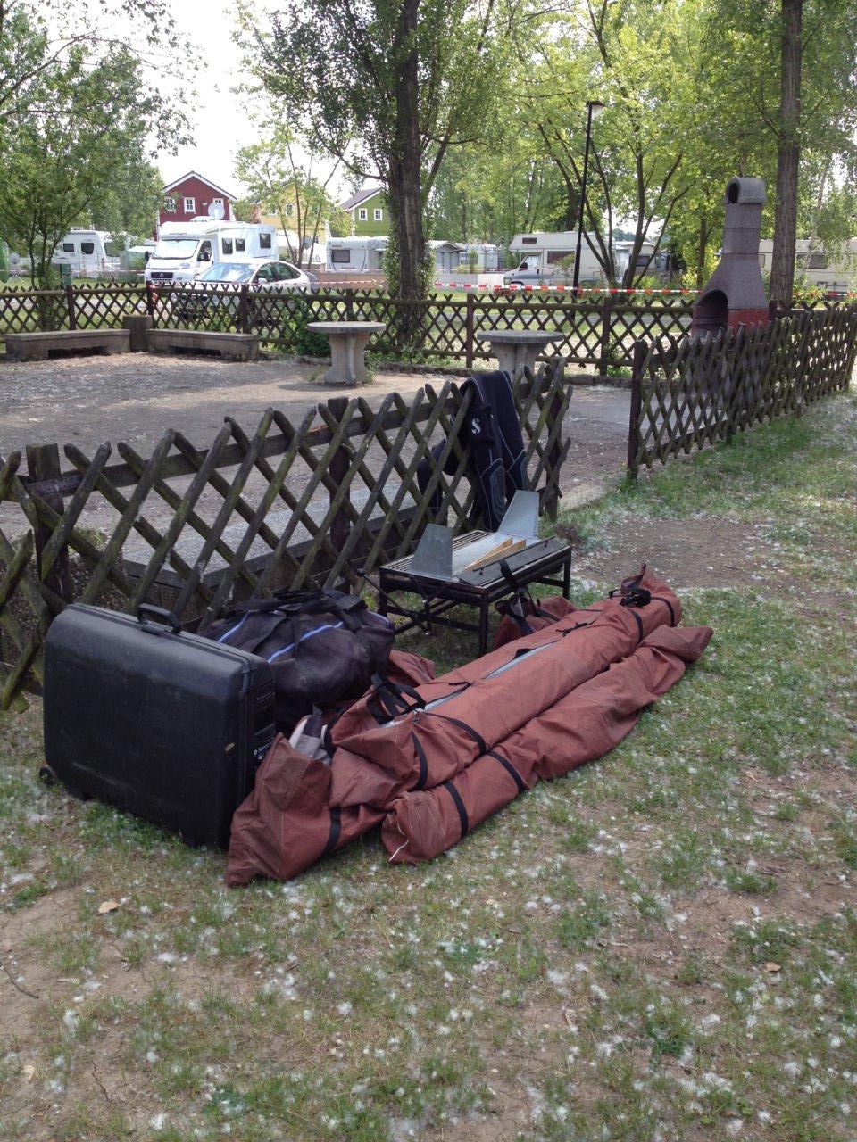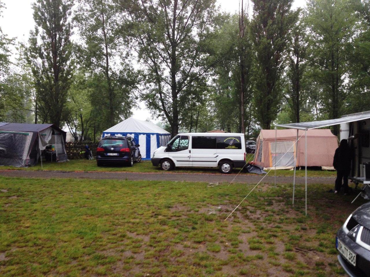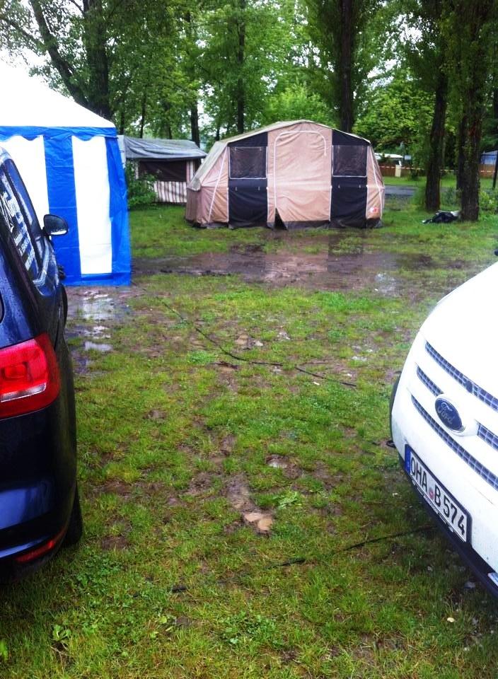 wie eigentlich immer beim Zelten am Kulkwitz See konnten wir unsere Hoffnung auf dauerhaft schönes Wetter kurz vor der Abreise begraben. Zwar noch trocken angereist wurden die folgenden Tage aber zu einer Schlammschlacht. Böse Zungen behaupteten wir wollten ein Pfützentauch-Brevet erfinden. Tag und Nacht prasselt der Regen auf die Zeltwände herunter und weicht kontinuierlich dem Boden auf. Aber schon am Herrentag hatte der Wettergott ein einsehen. Während des Forellenessens mit Livemusik klarte der Himmel auf, die Sonne ermöglichte die traditionelle Seewanderung und schlagartig war die Stimmung wieder auf höchstem Niveau.